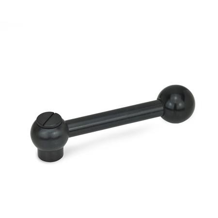 These adjustable clamping levers, GN 6337.3, are ideal whenever parts have to be clamped in a confined space or a particular lever position is required. The insert is connected with the lever via serrations in the ball bore which can be disengaged.
