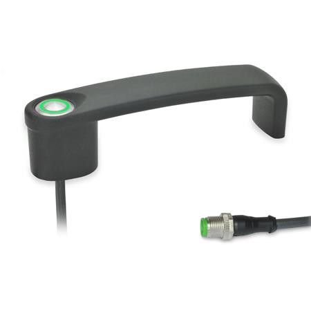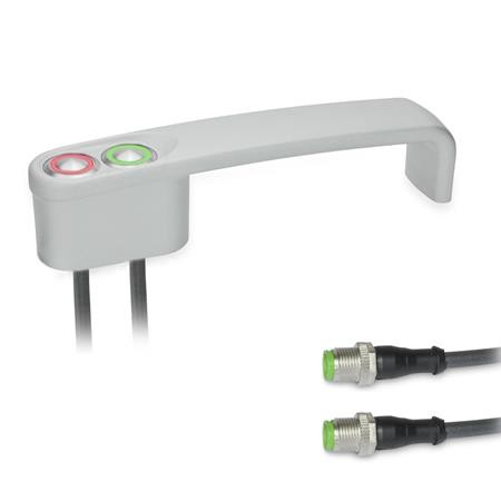 These GN 422 cabinet U handles come with either one or two push buttons. Each button has a changeover switch and integrated LED ring lighting. When the button is pressed, an electrical control impulse to switch off a machine, for example, can be triggered based on the wiring of the contacts (NC or NO).
