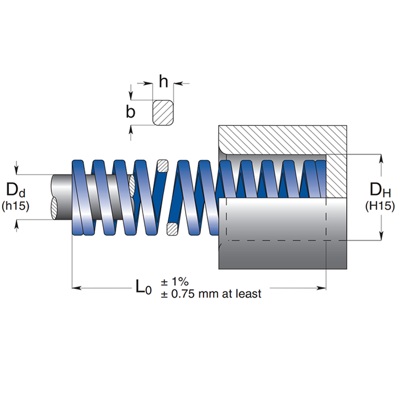 Our medium load die spring, for medium loads. Rectangular wire spring, made to ISO 10243 standards and RoHS compliant.