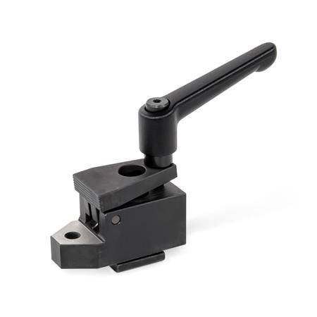 With side clamps GN 9190.2, workpieces are clamped with a pivoted clamping jaw. The clamping force acts laterally and from above to pull down on the workpiece and clamp it against fixed stops and the supporting surface. The thread integrated in the support accommodates any positioning or support elements as required.