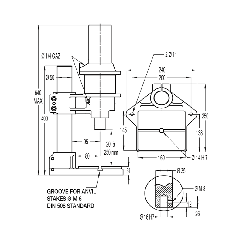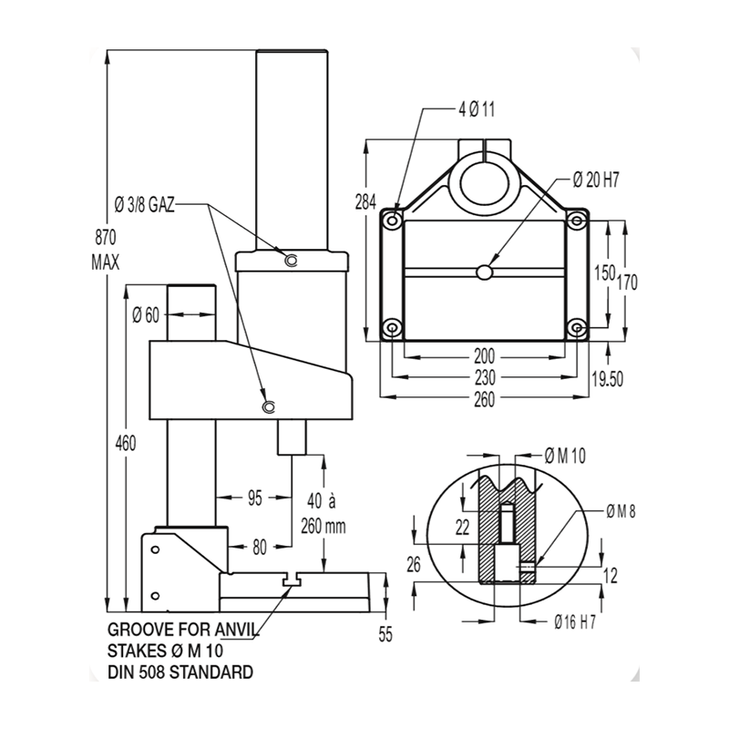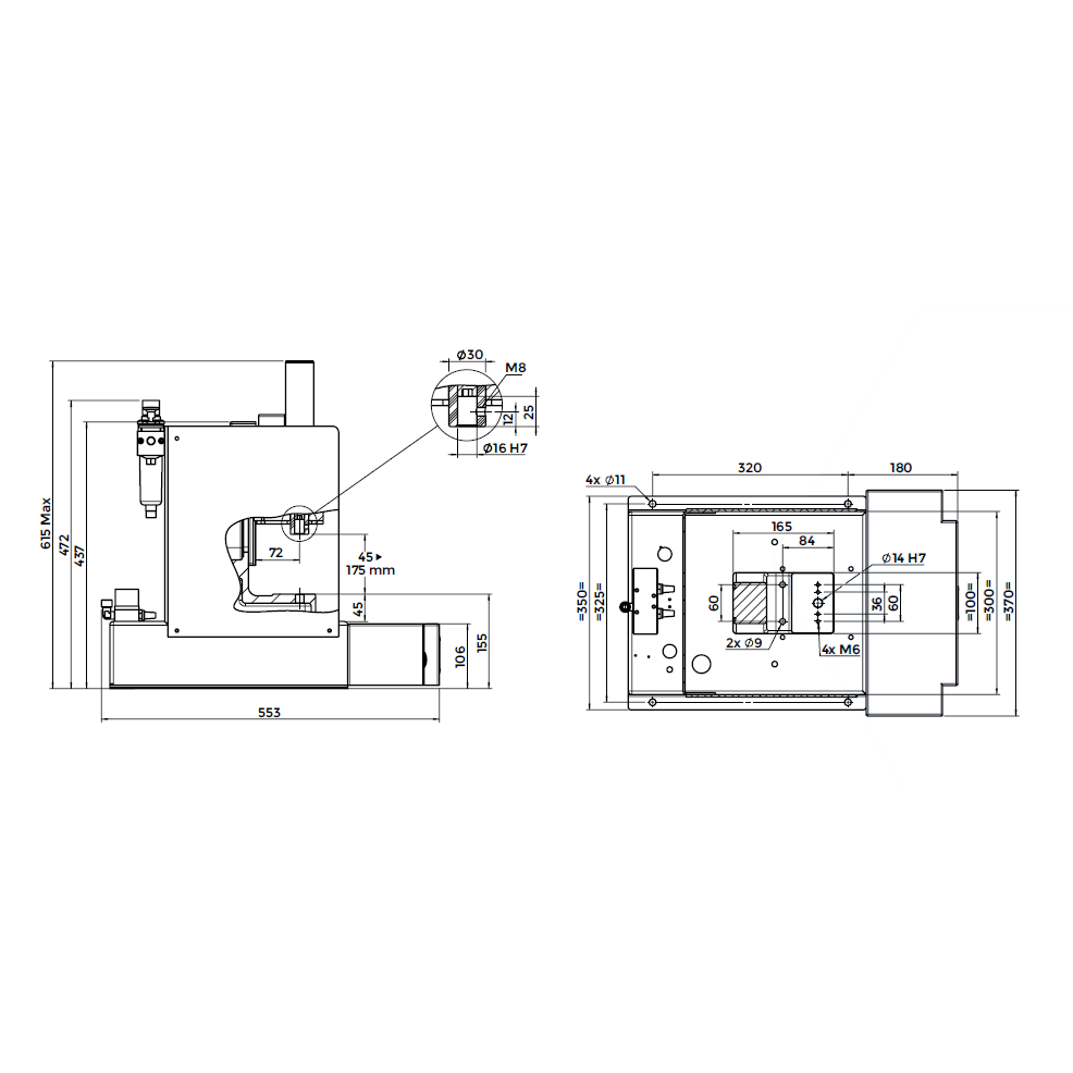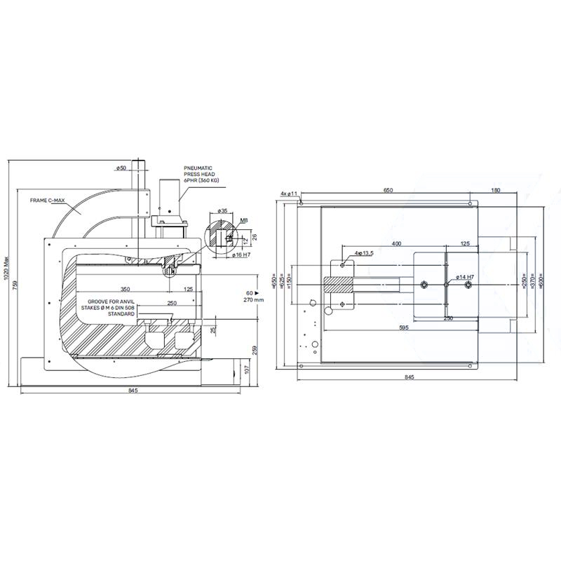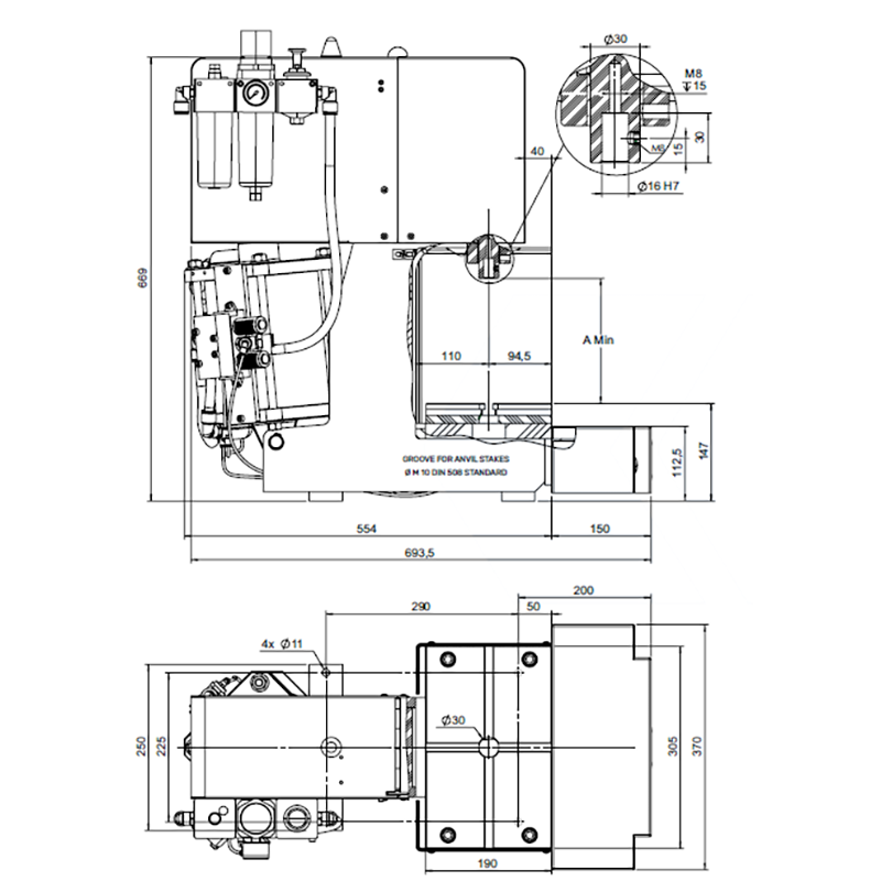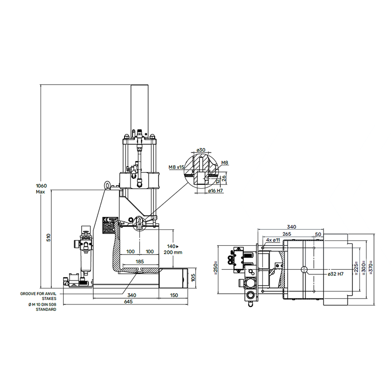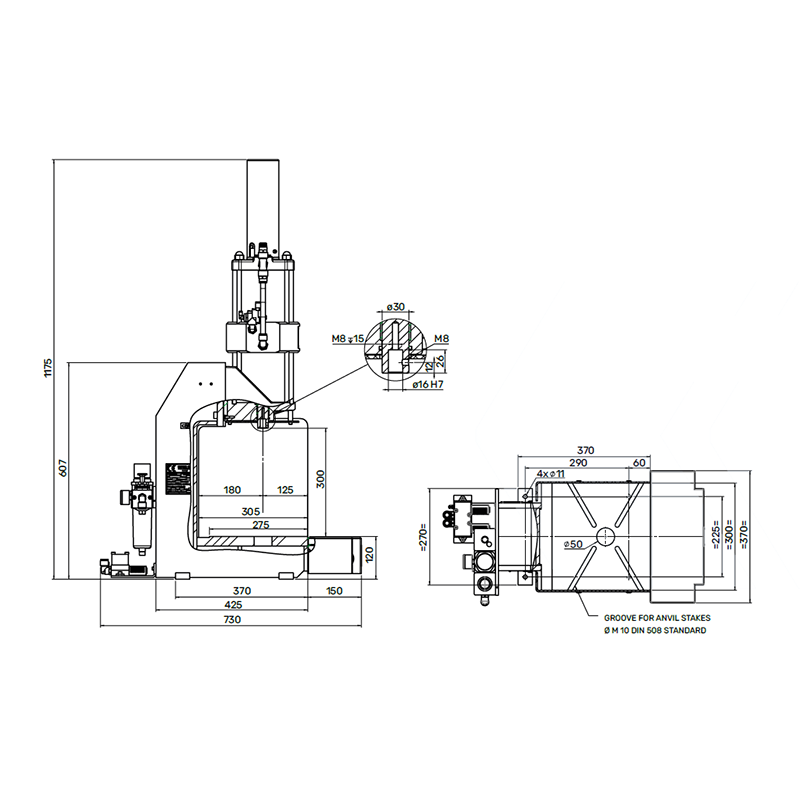 V2 -Machine with two hand controls, distributor and lubricator regulator filter, unit with built-in press pedestal, connected and ready to work.