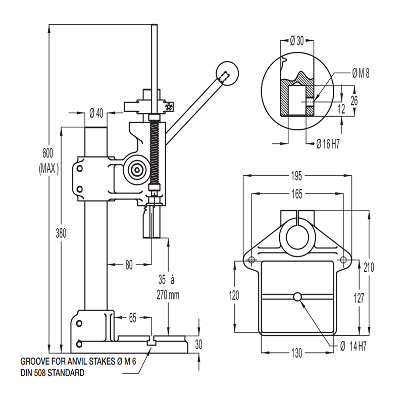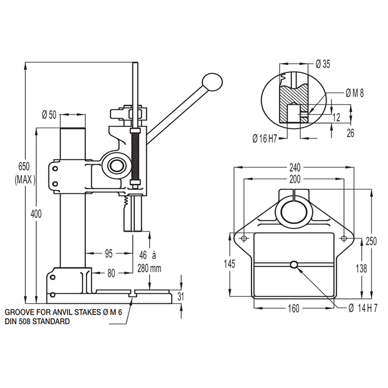 - Base support and press head made of FGL 250 cast iron, thus ensuring robustness and rigidity.