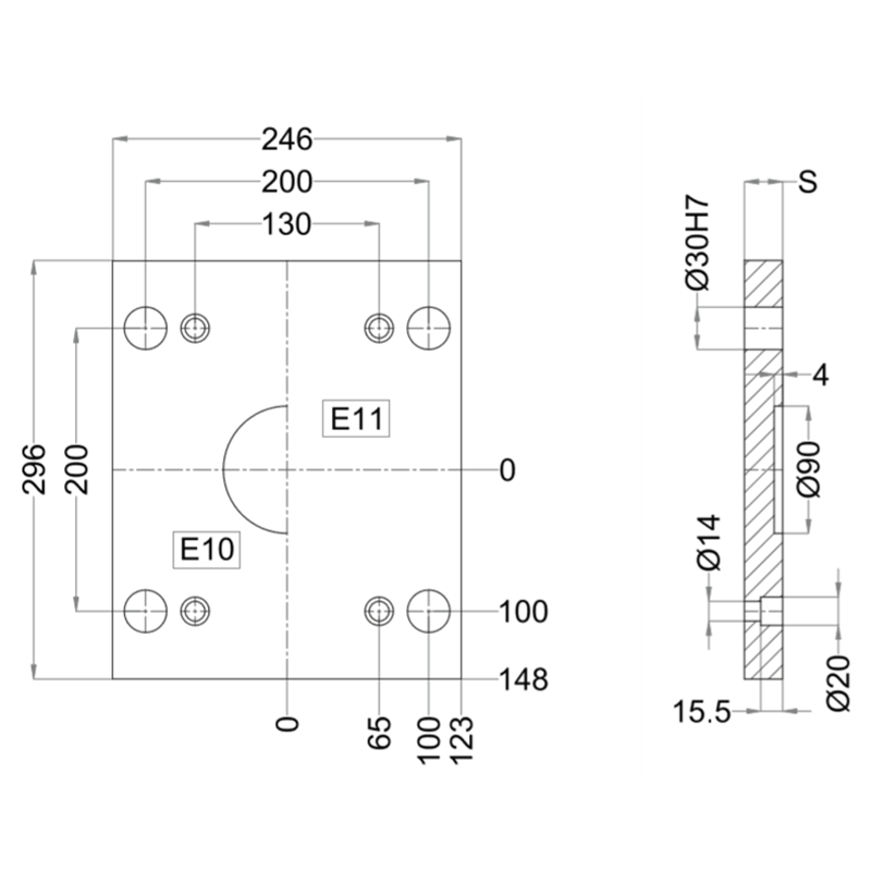 E10-246-246- Clamping Plate, Lateral Overhanging, with Locating Ring Recess
