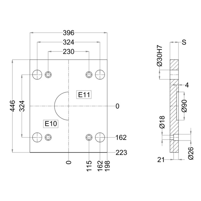 E10-396-396- Clamping Plate, Lateral Overhanging, with Locating Ring Recess