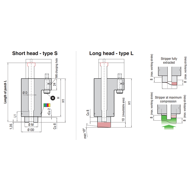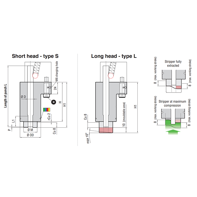 The unit is either available with basic stripper head (no punch point guiding shape built-in) or with punch point built-in. These are removable and machinable.