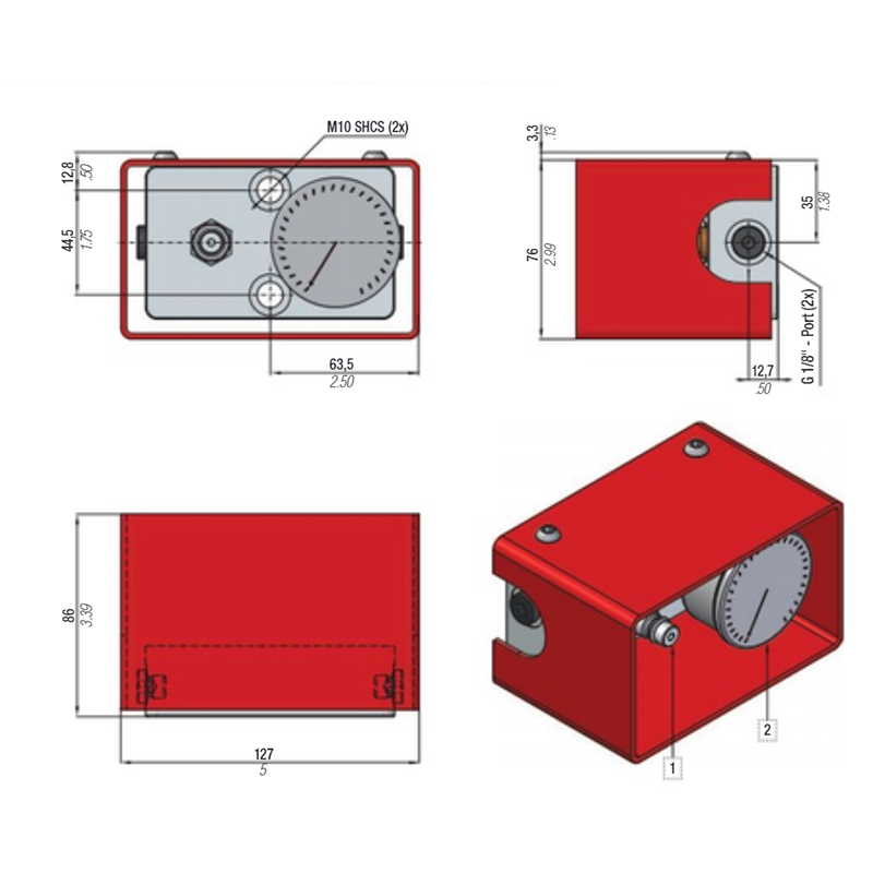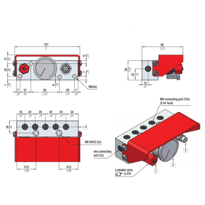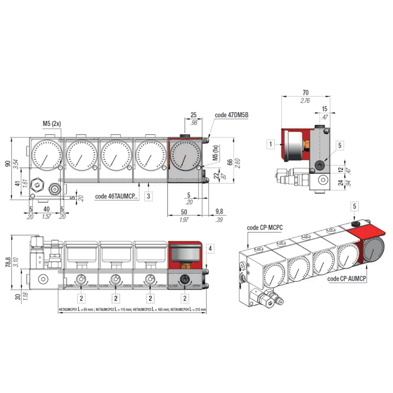 Additional units for mini control panel MCPC. Ideal for operating hosed systems or single cylinders with different pressures in the same mould. Each unit includes pressure gauge, on-off valve and one outlet. Designed for a maximum combination of 1 MCPC + 4 AUMCP.