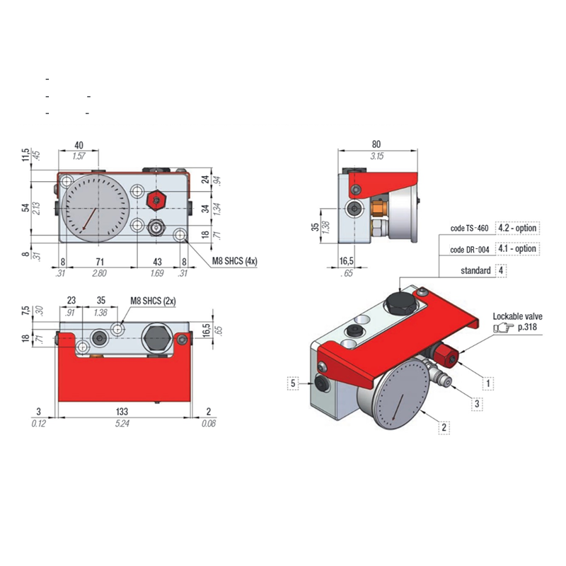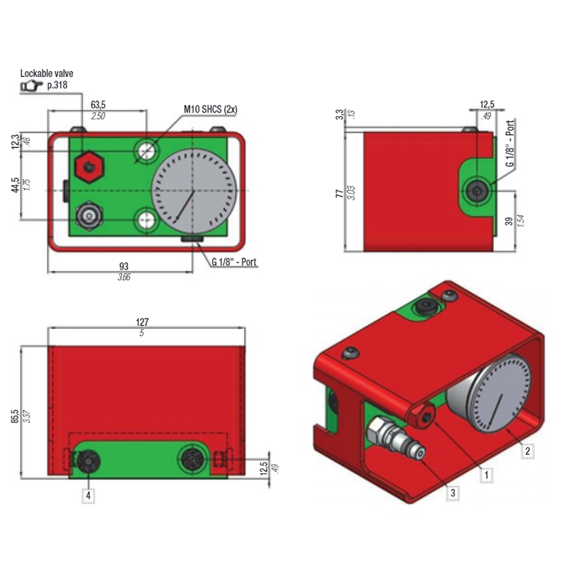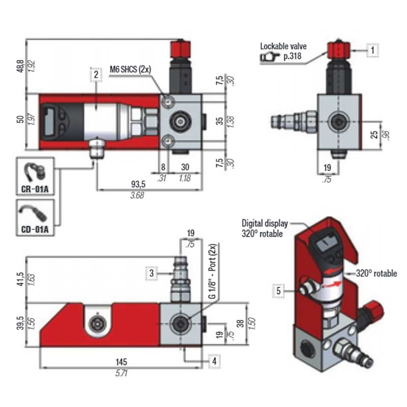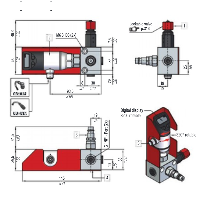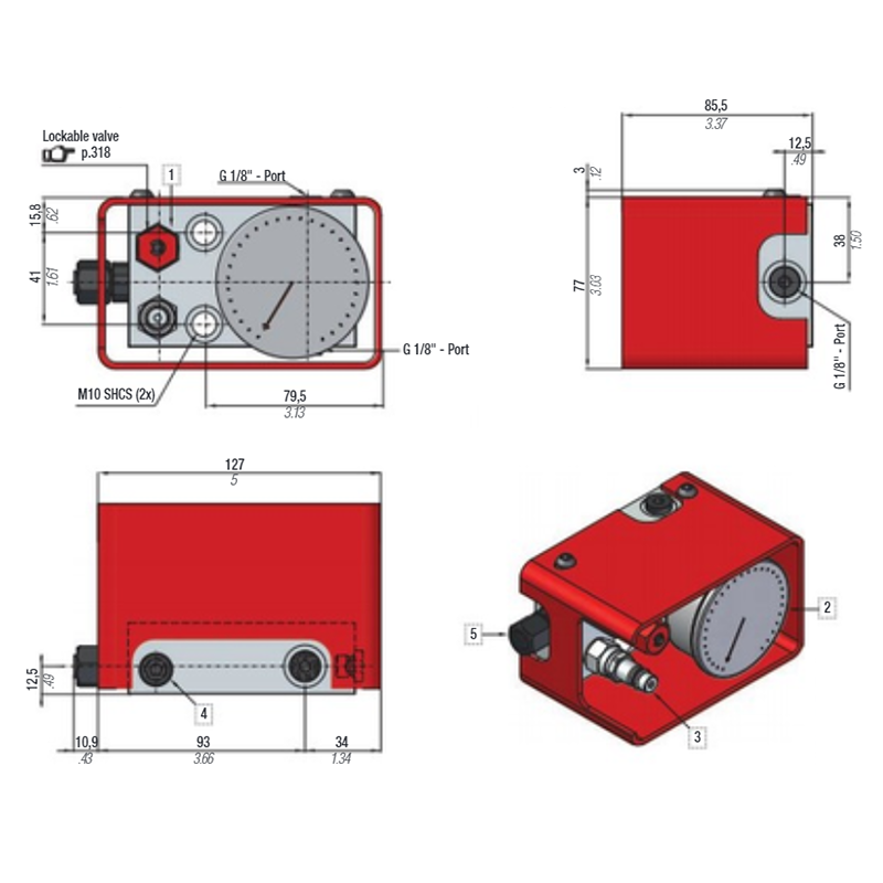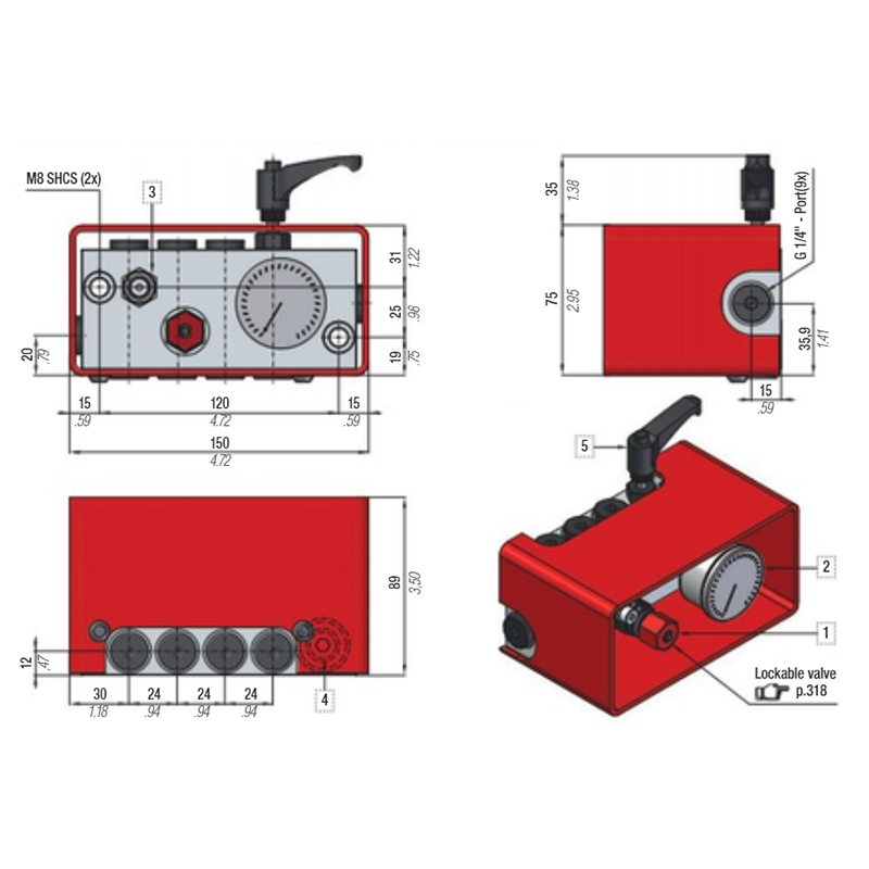 2. Pressure Gauge 0-620 Bar 5. 1/8" G connecting ports (5x)