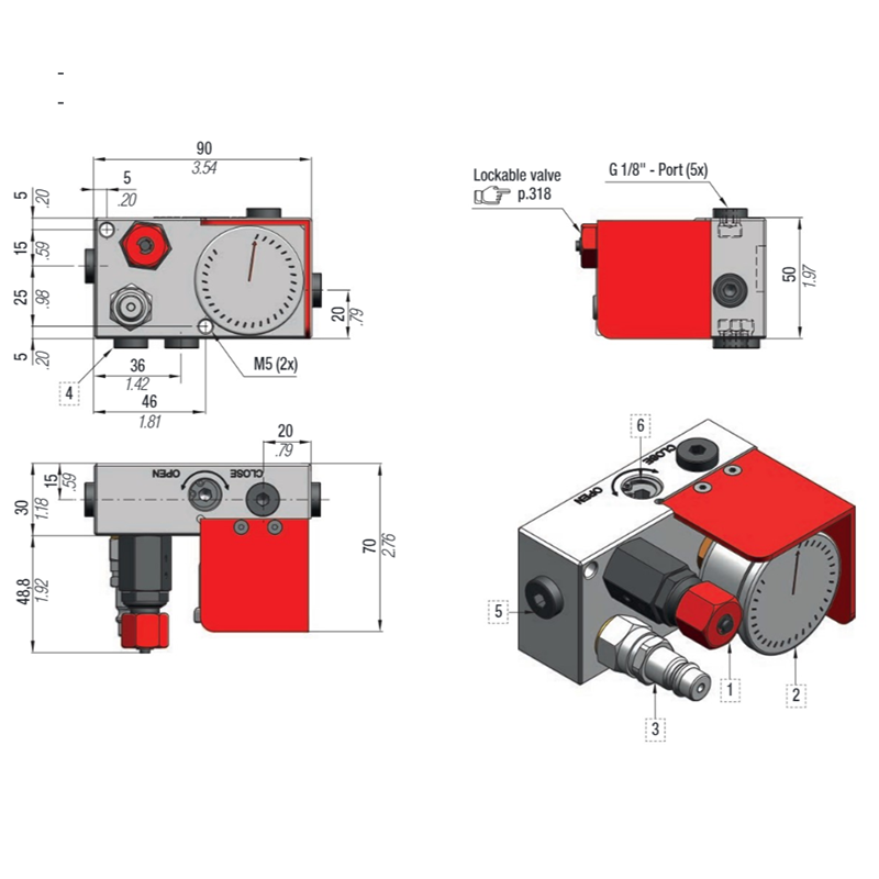 2. Shut off Valve 5. 1/8" G connecting ports (5x)