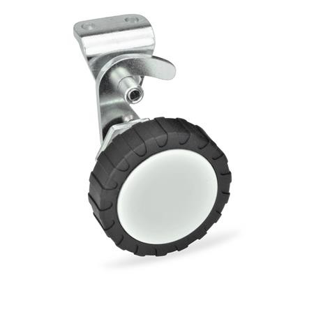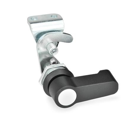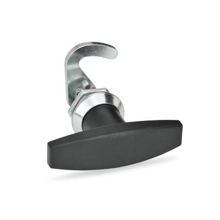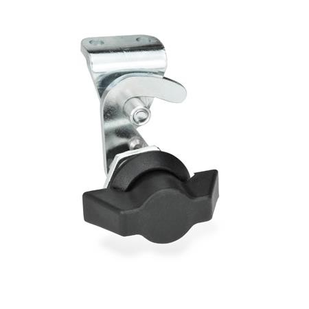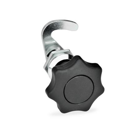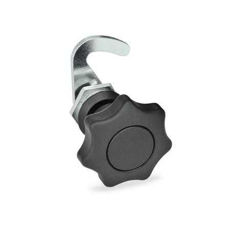 These hook type latches, GN 115.8, with hook and latch bracket, are ideal for use on sliding doors and flaps. The locking action is in radial direction to the axis of rotation, resulting in a wide variety of different uses.