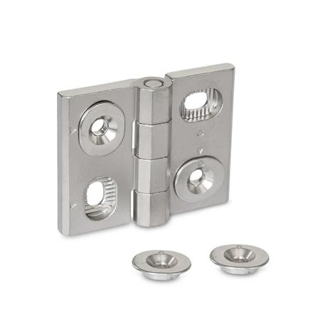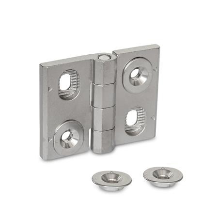 Stainless Steel Hinges GN 127 are used for doors and covers. They can be positioned snugly and in a finely adjusted manner by moving the adjusting bushings. In this way, door gaps can be readjusted and manufacturing tolerances can be compensated. The arrowheads mark the middle of the adjustable range w.
