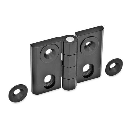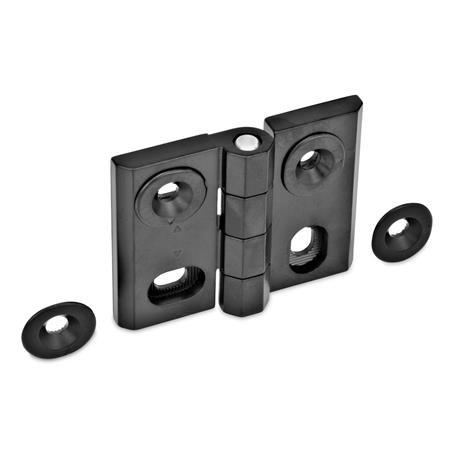 This hinge, GN 127, has a mounting position which is adjustable horizontally as well as vertically. It allows perfect positioning and alignment of the hinge, for example of a door in it's frame. The serrations at the wings of the hinge and at the adjusting bushes create a form lock which prevents the hinge from moving after installation. The tips of the arrows mark the 0 reference point for easier installation.