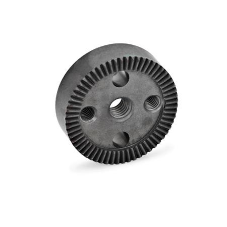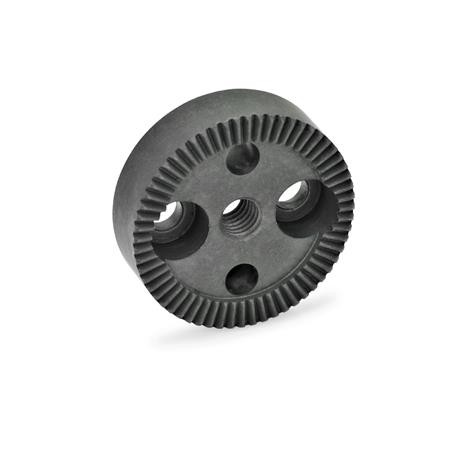 The angular position of the fixing bores in relation to the serrations is not defined in the standard design. The exact positioning is available as special design.