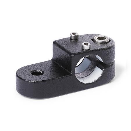 Swivel clamp linear actuator connectors GN 277.1 are based on swivel clamp connectors. The additional mounting holes are used to connect to the drive key of a linear actuator. Bores with the designation "'G"' are equipped with sleeve bearings.