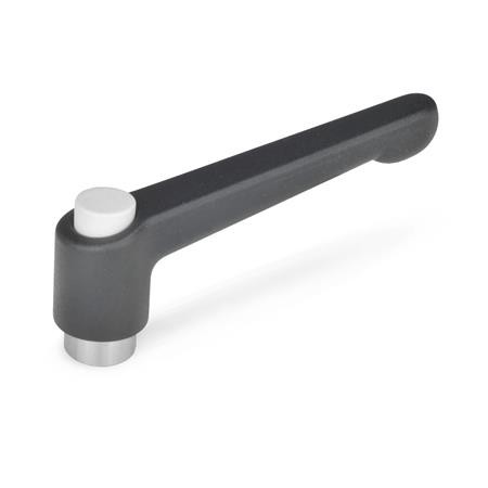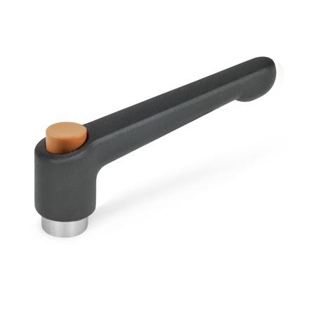 These adjustable hand levers, GN 303.1, are ideal whenever parts have to be clamped in a confined space or in a particular lever position. The centre insert is connected to the lever via serrations which can easily be disengaged, with the push button design element making disengagement particularly easy. Its use is limited to applications where dismantling of the lever for installation is not required.