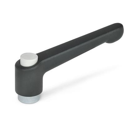 Adjustable hand levers GN 303.2 are ideal whenever parts have to be clamped in a confined space or in a particular lever position. The centre insert is connected to the lever via serrations which can easily be disengaged.