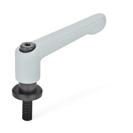Adjustable hand levers GN 307 are ideal whenever parts have to be clamped in a confined space or in a particular lever position. On releasing the handle the serrations re-engage automatically. When pulling the handle, the serration frees itself and can be re-located into any required position. Engagement is achieved by „releasing“ the lever. The washer cannot be removed. One typical application is to use the hand lever for slots.