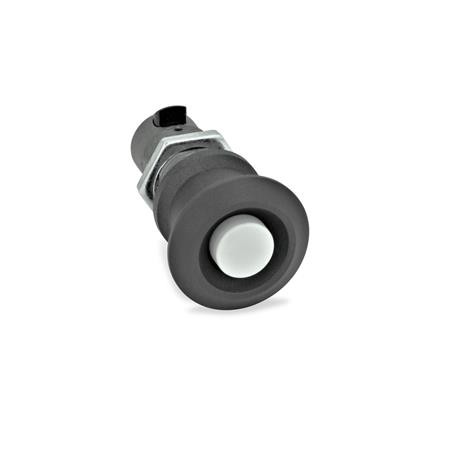 Snap locks GN 315 are characterised by a radial, spring-loaded slide causing the locking action. When the door is closed, the locking action sets in automatically: the chamfered slide is first pushed back via an appropriately arranged lug and then moved into the locking position by the pressure spring.