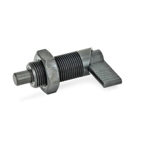 These cam action indexing plungers are used in cases where the locking pin must not protrude all the time. By rotating the lock through 180° the locking pin withdraws itself.