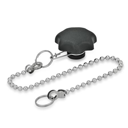 Star knobs GN 6336.13 can be captive-attached to a base element with the help of a ball chain or a retaining cable.