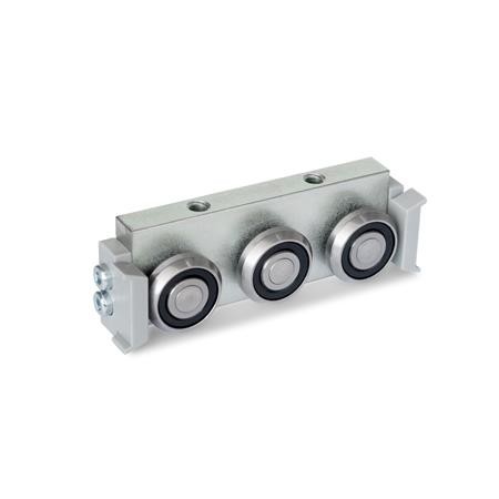 These roller carriages GN2424 are combined into roller guide systems together with rails GN2422. These space-saving units are suitable for carrying sliding doors or are used in mechanical engineering or jigmaking for the linear traversal of plant sections.