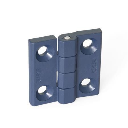 These GN 237.1 hinges are made of blue plastic granulate that is FDA compliant as per FDA CFR.21 and EU 10/2011 as well as visually detectable or metal detectable.