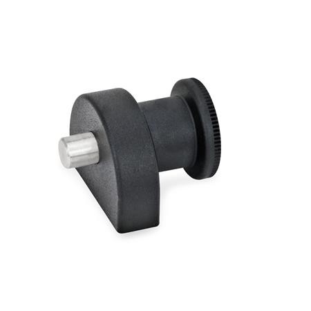 The outstanding feature of the indexing plungers, GN 412, is their compact design. They are mounted either from the front with cylinder head screws or from the back through threads. In Type C, the knob can be turned by 30° after retracting the indexing pin, holding it in the "retracted" position by means of the indexing lock.