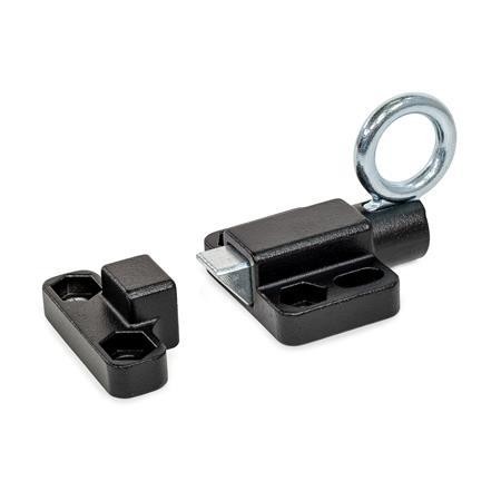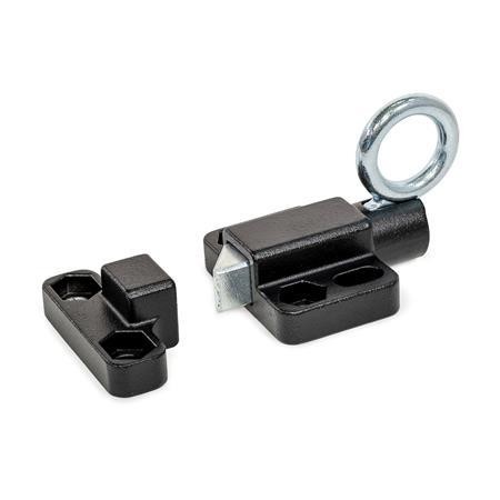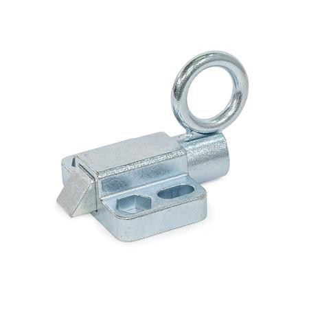 The latching can be released by pulling the pull ring by hand or with a cable or pull rod using a hook. The types with rest position are used when the plunger pin should temporarily not protrude. For this purpose, the pull ring is turned sideways after the plunger pin has been retracted. The ring is held in this position by the catch recess at the top of the guide.