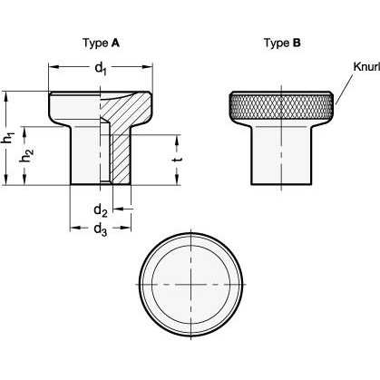 The GN 676.5 concave knob is used in applications where a push or pull movement is required. Their concave top gives a more comfortable thumb grip, and knurling makes this grip more secure. The knurled model (Type B) can be used as an attractively shaped knurled knob with a threaded blind hole.