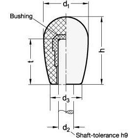 The DIN 719.1 domed knob is often used instead of the DIN 319 ball knob on switch levers, and gear levers due to ergonomical reasons. These knobs are mounted by using a plastic hammer to drive them over a shaft end which should preferably be slightly rounded or phased (30°). The bushing is embedded during the manufacturing process, and it does not need insertion before driving it over a shaft.