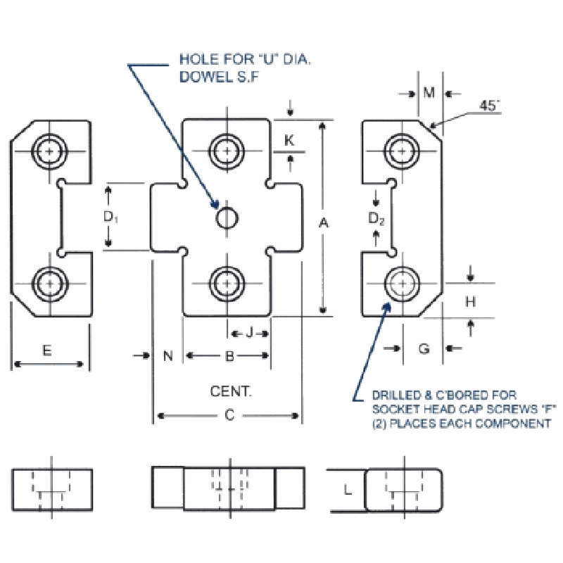Best located in pockets on the side of the cavity plate, these tapered locks locate between 10 and 30mm before the split faces meet and are ideal for applications where there are fragile ribs in the mould.