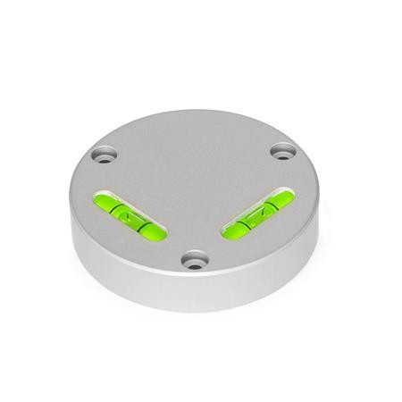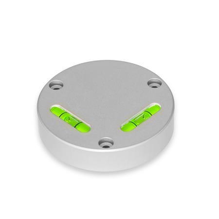 The spirit levels of type JV are aligned using the fastening holes that are offset by 120°. An alignment ball on the bottom serves as a pivot point. With careful tightening, it is possible to achieve an alignment that places the bubbles between the middle marking lines.
