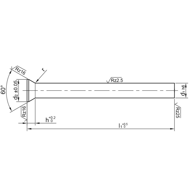 These precision punches with countersunk (conical) head. DIN 9861D, are hardened, tempered, ground and lapped all over. Head hot forged and annealed. In contrast to type DIN 9861 DA these have a fine ground finished shaft (d1) h6 tolerance up to the head.