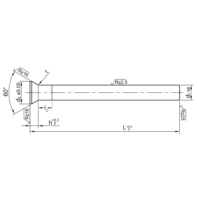 Precision Punch with countersunk (conical) head DIN9861 DA are hardened, tempered, ground, head hot tempered and annealed. DIN 9861 DA standard with permissible thickening under the head (d3 in diagram and table).