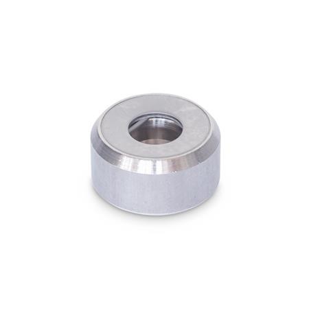 Stainless steel thrust pads GN 6311.1 are used in conjunction with grub screws fitted with thrust point (grub screws DIN 6332, tommy screws DIN 6304 and DIN 6306) to transmit clamping force. They align themselves on uneven and non-parallel surfaces and thus prevent the rotating force being transmitted to the workpiece.