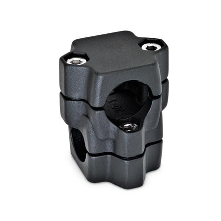 The clamping bores of two-way connector clamps GN 134 are machined and designed for construction tubings GN990 or DIN2391, DIN2395 and DIN2462 respectively. The square bore version is also suitable for use with profile systems.