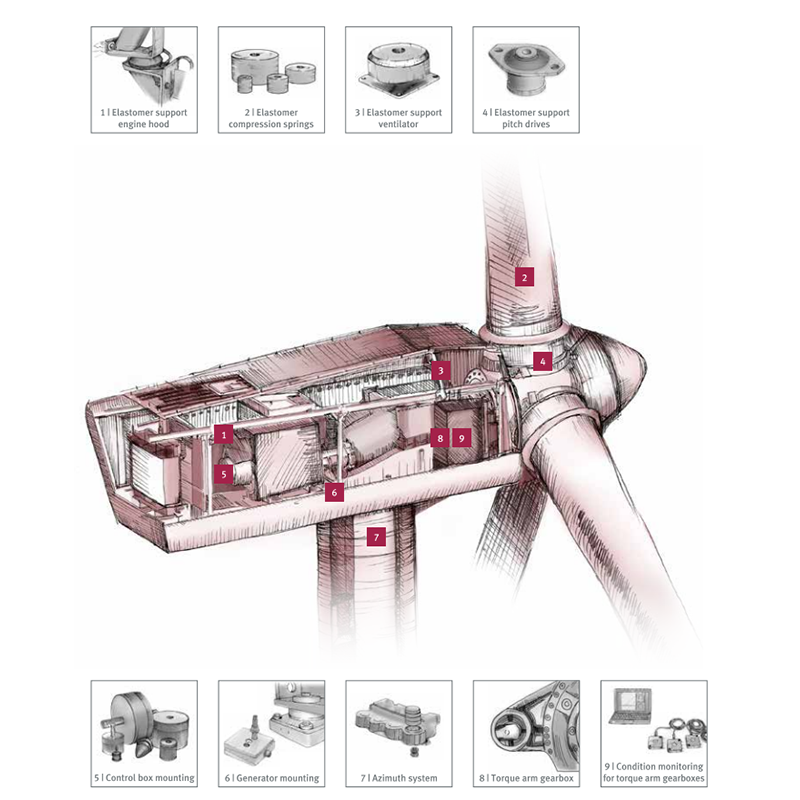 Azimuth system Bonded spring assembly made of EFFBE Urelast® which is designed to avoid the loss of the braking effect of the claw bars in the azimuth system. • Unbreakable - Elastomer compression springs retain force, an absolute loss of force is not possible • Free of wear • Flatter spring characteristic • Larger permissible load range in comparison to plate springs, for same installation space • Preload force adjustable by varying rotation angle • Avoidance of total failure of azimuth drives • Same installation space/connection dimensions |